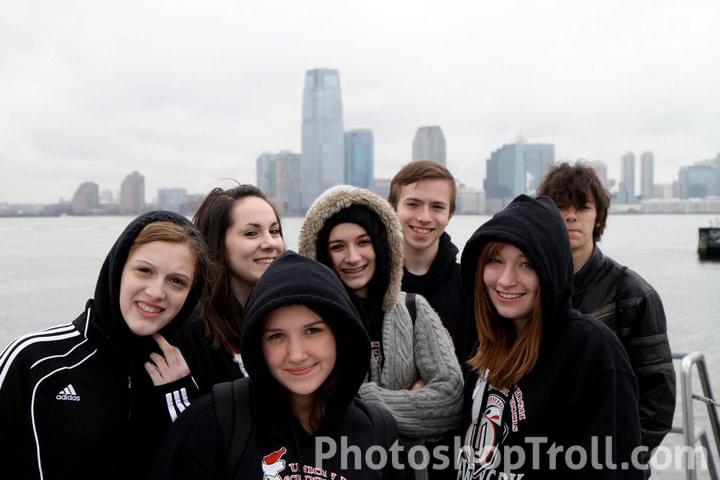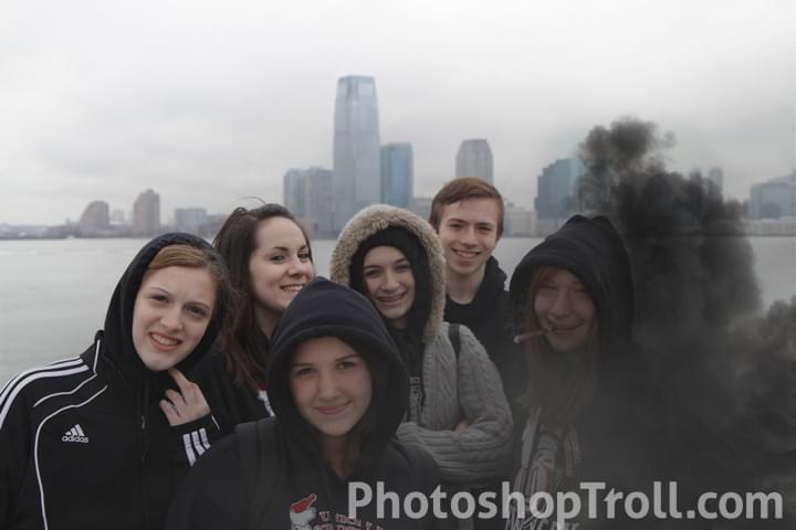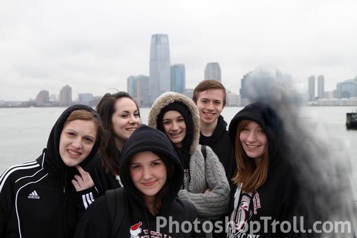 Hi, I went with a group of people to NYC and we took this picture...but there's one guy that none of us like. If you could please try to remove the guy on the far right behind the red-headed girl? Thank you so much.